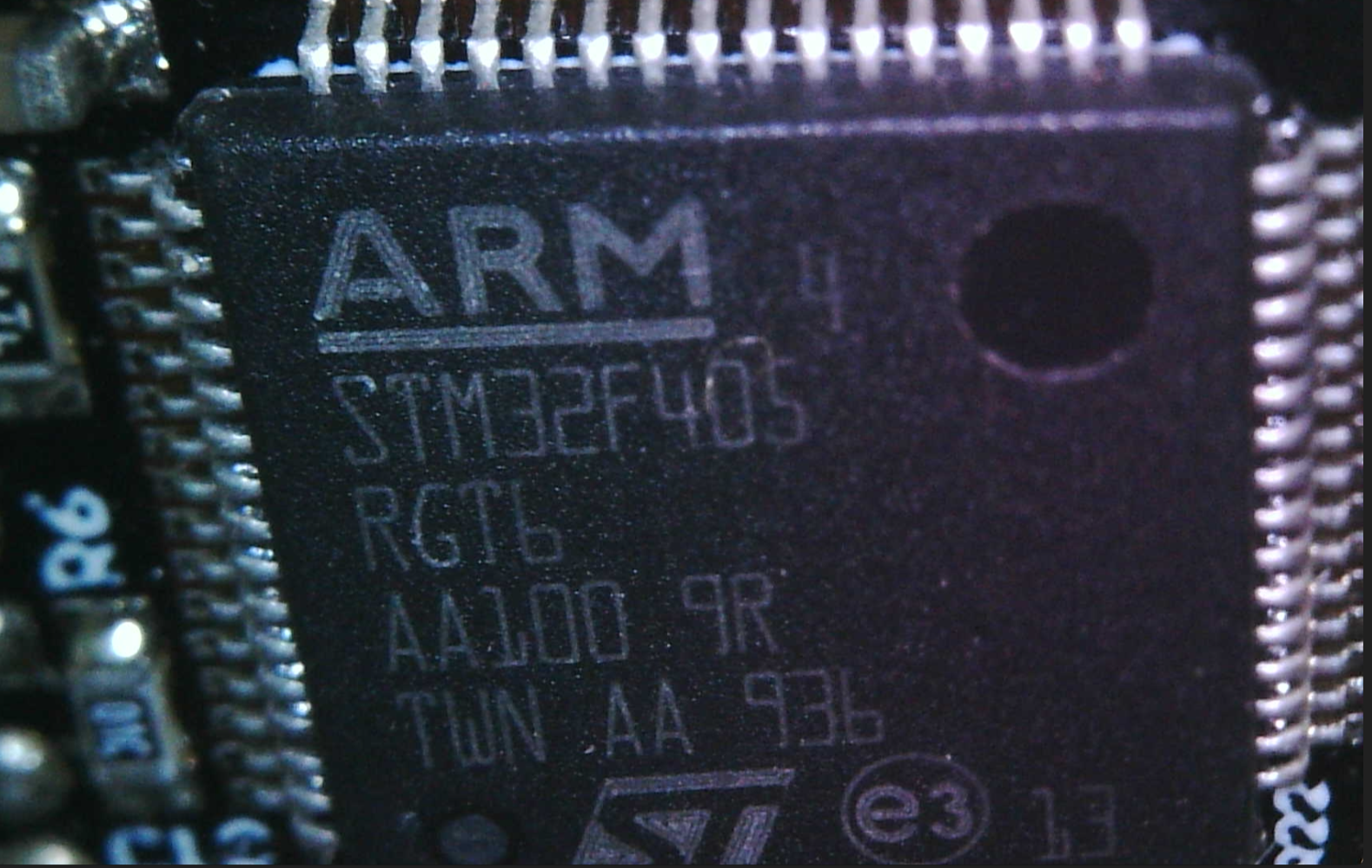 As you can see we have an ARM STM32F405RGT6 MCU. By following this guide, we can deduce that this chip is a STM32 F-Type ARM Cortex M4, 64-pin, with 1024 KByte flash-memory, LQFP package that can operate in the -40degC - +85degC temp range.