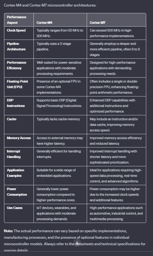 Cortex M4 to M7 Performance Comparisons (via ChatGPT):