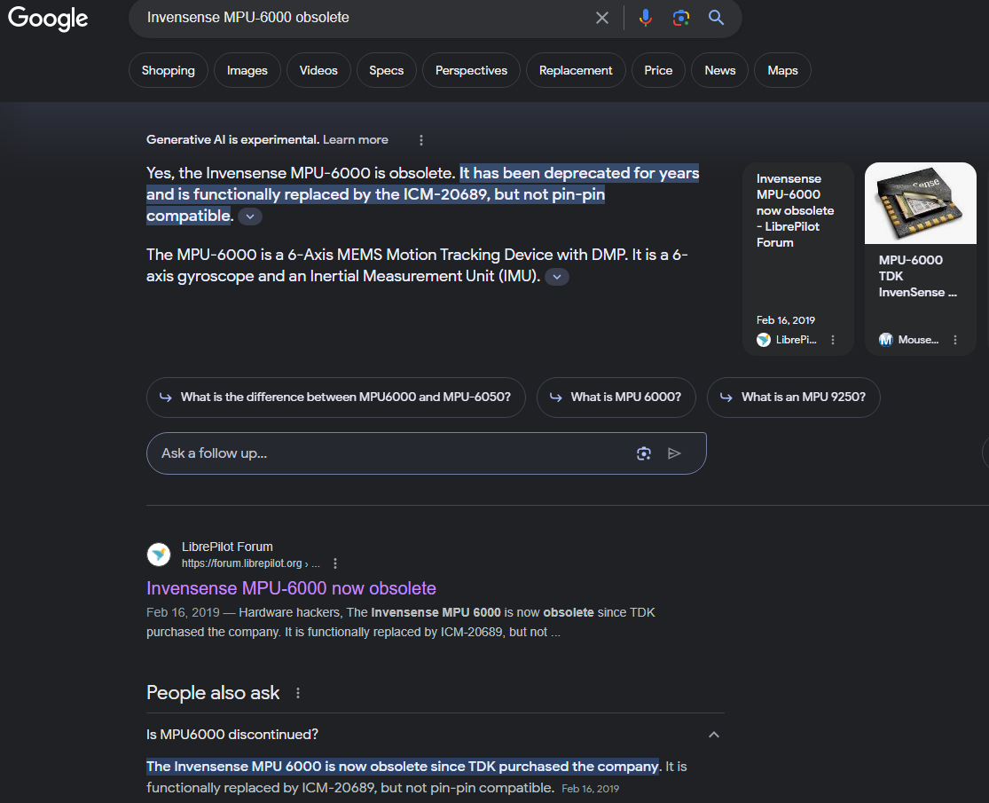 As previously noted, the MPU6000 has been discontinued and is considered obsolete. It was also noted that the ICM42688P and ICM42605 have been optional hardware to use. Although the hidden agenda of this article is to consider if the updated components offer better performance, I bring forward a citation from an engineer with some insight:
